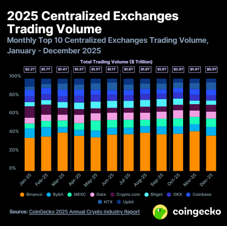 CoinGecko knowledge reveals that Binance held the identical place in December with a 38.3% market share, however with spot buying and selling quantity reducing by over 40% month-on-month to $361.8 billion.