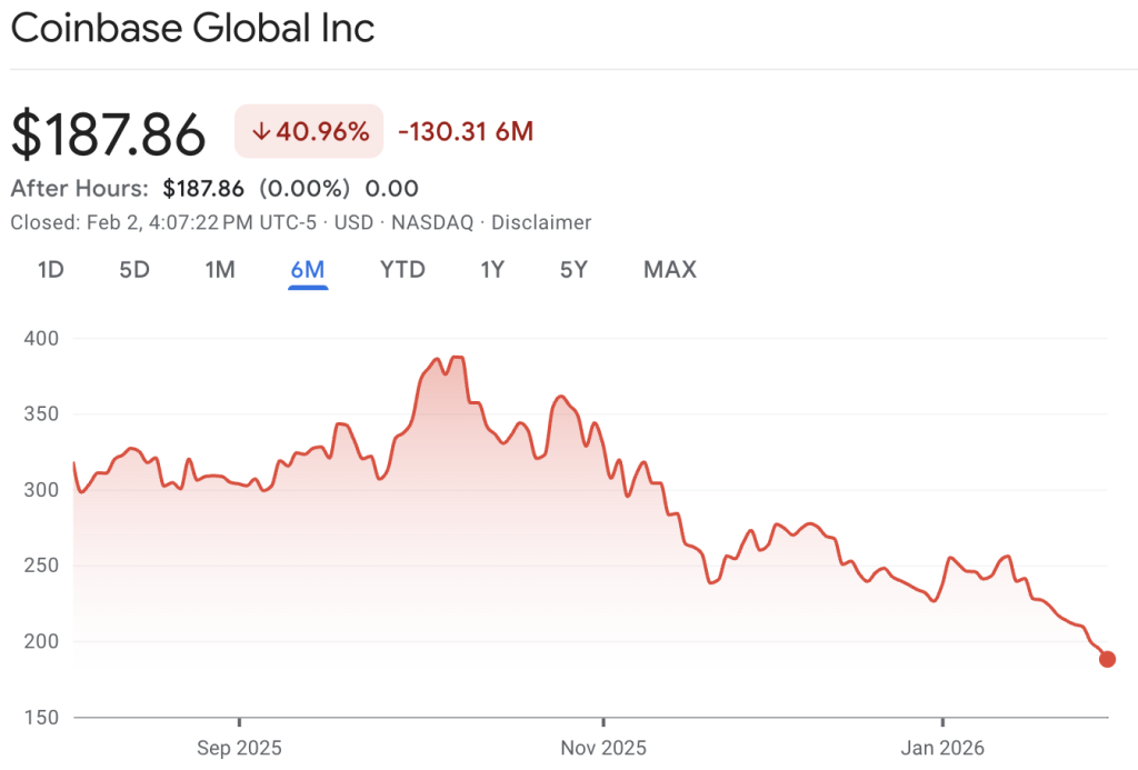 Shares of Coinbase, Gemini, and Bullish have all underperformed broader fairness markets since October, falling much more sharply than Bitcoin itself, which is down about 35% from its peak.