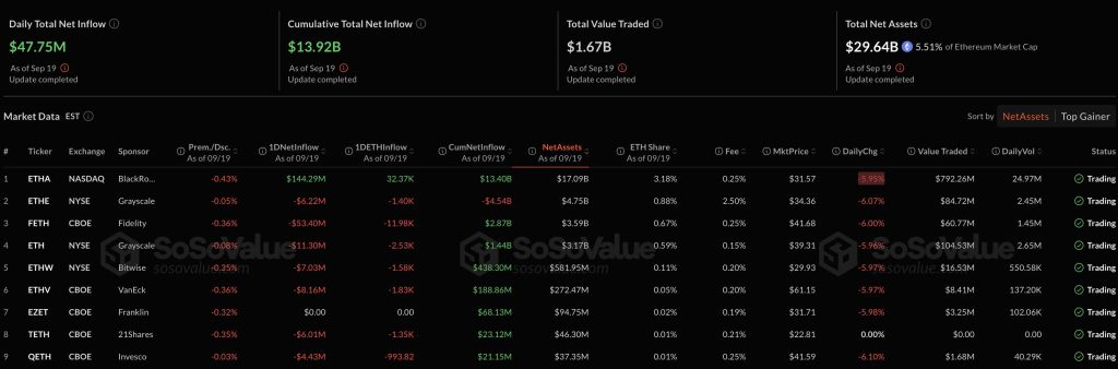Ethereum ETFs additionally recorded notable exercise. BlackRock’s ETHA product led with $144.3 million in inflows, whereas Grayscale, Fidelity, and Bitwise merchandise noticed modest outflows.