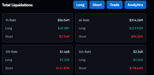 The complete crypto market capitalization stands at $2.92 trillion, and, according to CoinGlass information, greater than 416,000 merchants closed their positions over the previous 24 hours, which noticed greater than $2.24 billion liquidated from the general crypto market.