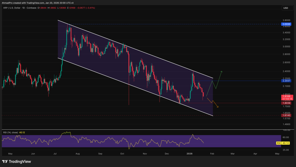 At the time of writing, XRP is buying and selling round $1.90 and shifting towards $1.80, which has acted as the primary help stage over the previous 12 months. A clear lack of this space would probably open the door for a deeper correction towards the decrease finish of the downtrend channel close to $1.61.