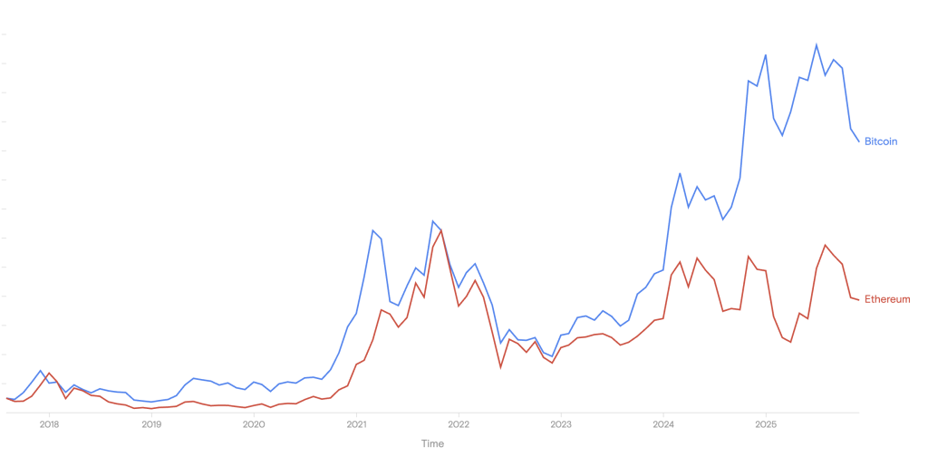 ETH bulls argue that Ethereum didn’t get what it deserved over the past bull run. If you look intently, the ETH worth didn’t break its all-time high till very late within the cycle, and by then, Bitcoin was already buying and selling across the $115,000 stage.
