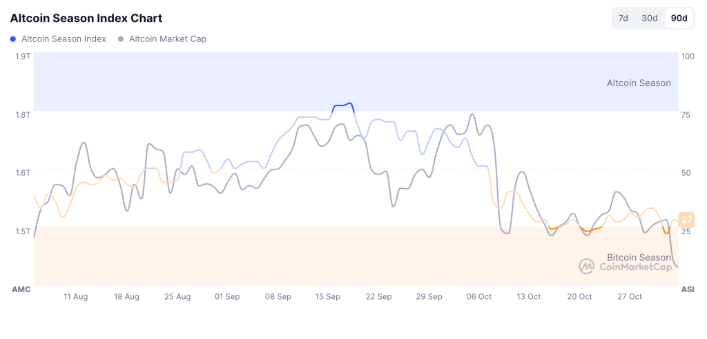 The Altcoin Season Index beneath 30 reveals that the market remains uneven. Most belongings nonetheless lag behind Bitcoin over the current cycle, however cash with distinct use instances or constrained provide are discovering short-lived home windows of power.