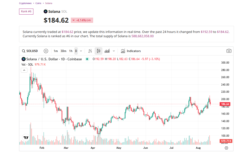 Solana briefly touched $205 this week before pulling back to $186.78, down 4.5% in the past 24 hours but still outperforming the broader crypto market.