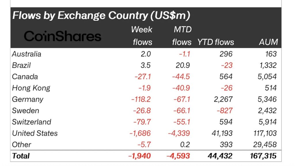 Flows by trade nation present the United States as soon as once more dominated the outflow image, with $1.686bn in weekly withdrawals — in step with U.S. establishments driving a lot of the current derisking. Germany, Canada, Sweden, and Switzerland additionally noticed sizeable redemptions, contributing to the weekly world whole of $1.94 billion.