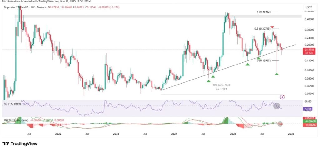 But the timing has been ruthless. Dogecoin’s worth has fallen over 21% prior to now month, slipping under $0.17 because it checks a long-term assist stage that has held since late 2023.