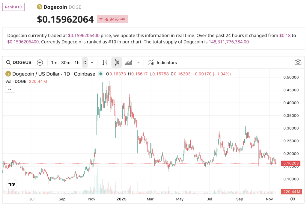DOGE is at present buying and selling close to $0.163, down nearly 7% within the final 24 hours.