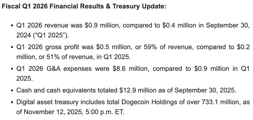 General and administrative bills soared to $8.6 million from $0.9 million, pushed by skilled charges, stock-based compensation, new salaries, and insurance coverage prices tied to its Dogecoin treasury rollout.