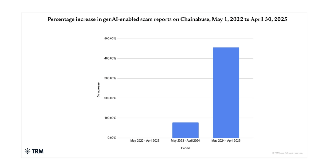 In 2025, blockchain analytics corporations reported that common rip-off funds rose greater than 250%, whereas AI-assisted scams have surged by greater than 450%, as criminals deployed deepfake audio, artificial identities, and automatic phishing at scale.