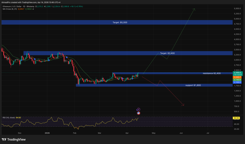 Ethereum value is buying and selling at $2,355 in April 2026, up 8.09% on the month-to-month chart after the $2,000 month-to-month low was examined and held a multi-year ascending assist trendline connecting each main ETH bear market backside since 2019.