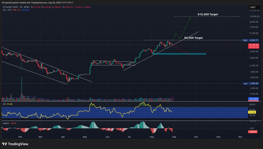 Ethereum has surged over 200% in current months, hitting an all-time excessive of $4,953 earlier than pulling again to $4,318 on the time of writing – a rally that has solely strengthened the present Ethereum price prediction.
