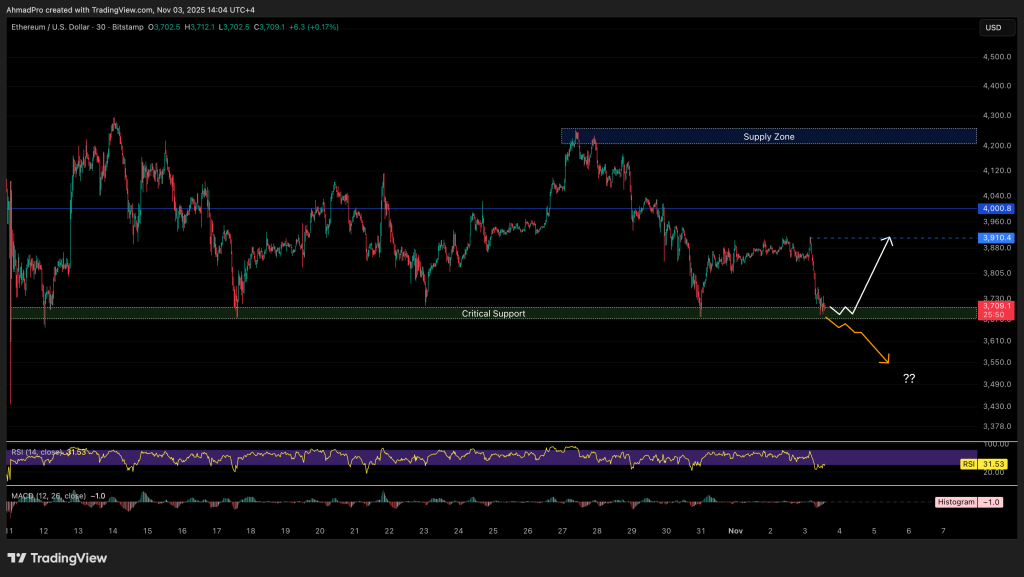 With the RSI sitting at 31, ETH is deep in oversold territory, which suggests a possible short-term bounce. If the bulls can defend this help, a transfer towards the three,900 stage appears doable.