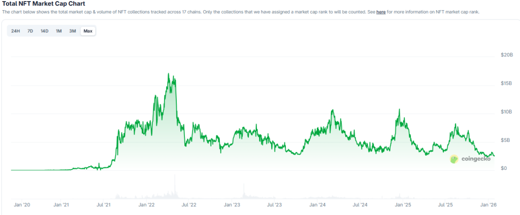The complete NFT gross sales income declined by roughly 37% yearly in 2025 to roughly $5.63 billion, and complete provide elevated.