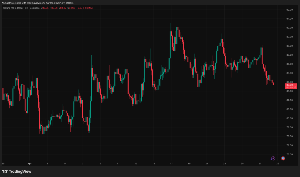 Solana price is holding its floor, barely. SOLUSD trades close to $84, up roughly 1.8% over the past 24 hours after oscillating between $82.70 and $85.67.