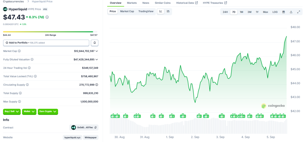 Hyperliquid’s governance token, HYPE, has rallied sharply alongside its monetary efficiency. The token traded at $47.43 on the time of writing, up 4% over the previous day and seven% up to now week, according to CoinGecko.