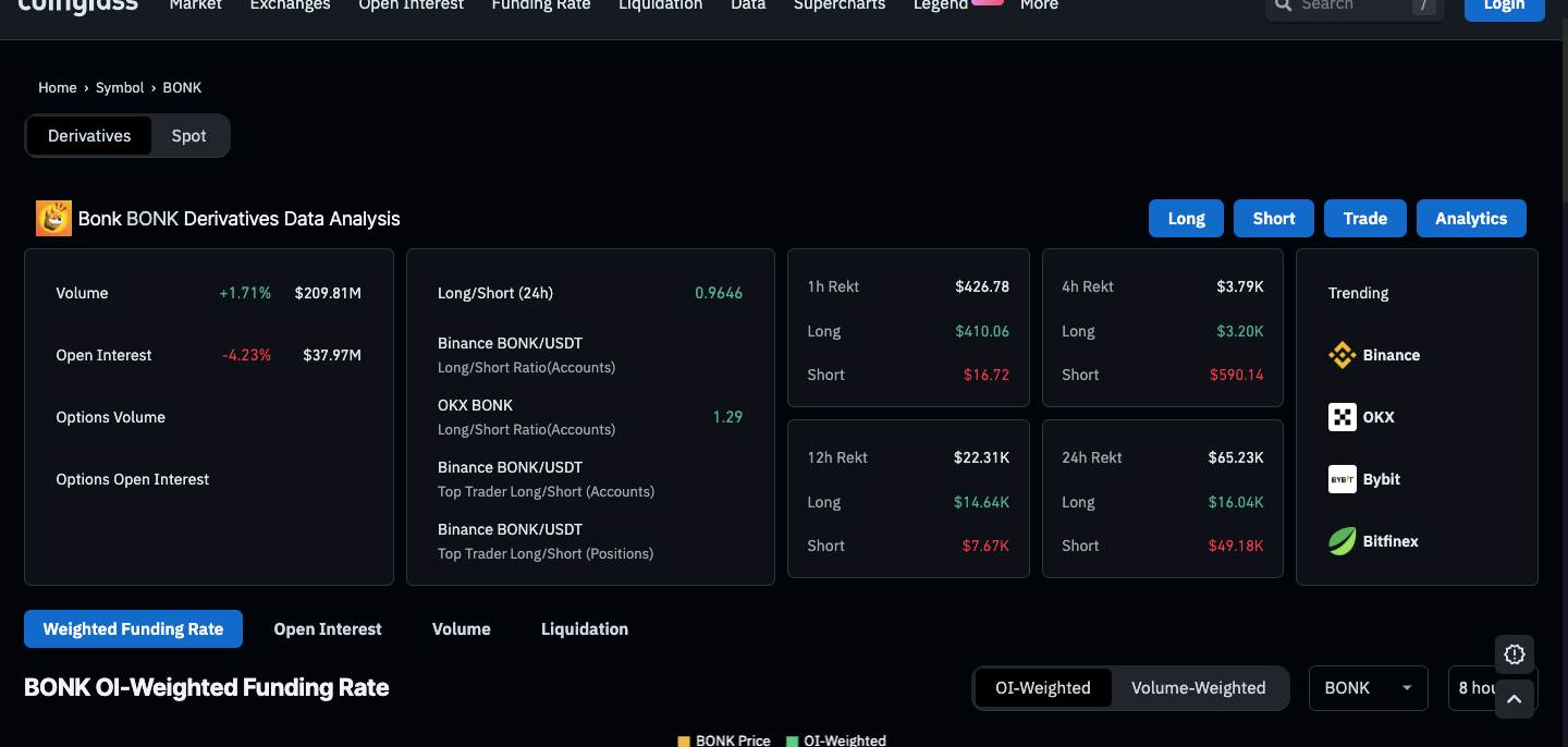 Regarding Bonk’s derivatives data, the unwind in open interest is more telling. Open interest is down 4.23% to $37.97 million, suggesting a pullback in speculative activity.
