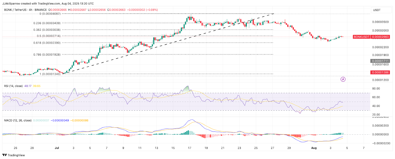 The $BONK price is currently hovering around $0.00002660, attempting to stabilize above the 0.5 retracement level at $0.00002714.