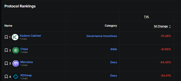 Most of its DeFi protocols have suffered sharp declines in liquidity. Kadena Cabinet, a governance platform, dropped over 70% in TVL within the final day, whereas decentralized exchanges like KDSwap and Mercatus fell by 83% and 64%, respectively.