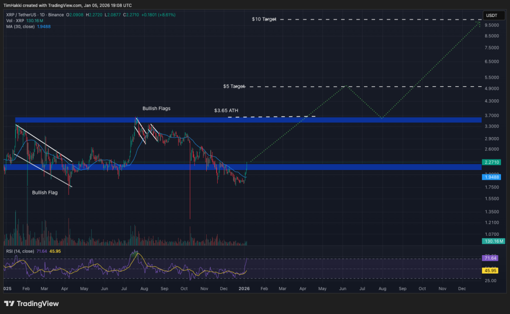 Firstly, Ripple’s XRP ($XRP) has began the yr with a bang after rising 16% in the final seven days. Claude AI predicts that if bullish momentum holds, XRP may effectively hit $10 by late 2026.