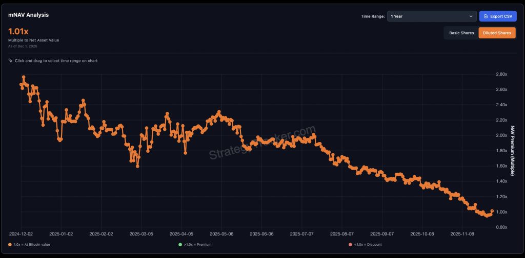 Earlier within the 12 months, the ratio traded as high as 3.3, however by mid-November it slipped under 1.0 for the first time since Strategy started buying Bitcoin.