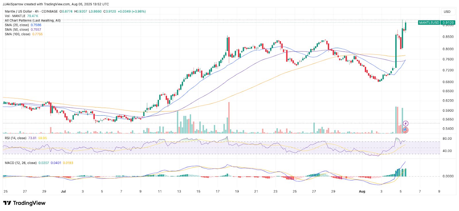 The 4-hour price chart backs up the strength of the rally, as $MNT pushed well above its 20, 50, and 100 SMAs, all now stacked in proper bullish order.
