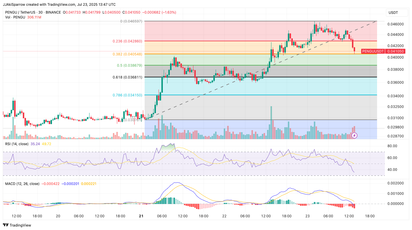 In the near term, PENGU’s ability to stabilize around the $0.0400–$0.0405 area will be key.