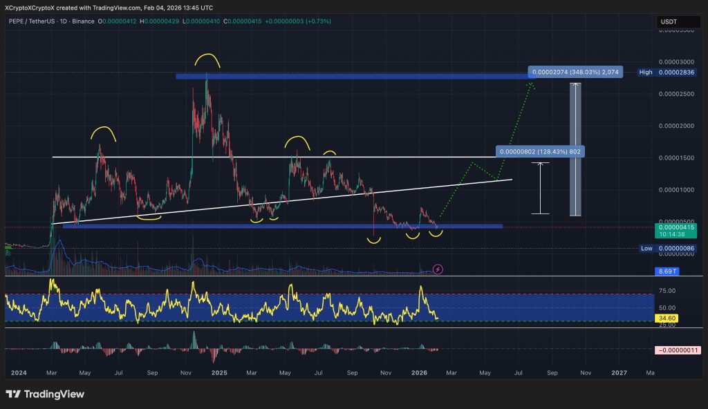 Pepe is now retesting its most essential bull market proving floor, with a historic demand zone round $0.000004 that has held for nearly two years.