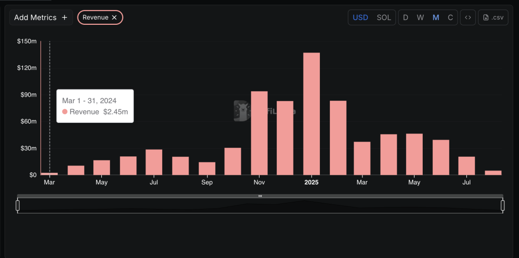Despite its resurgence, the broader meme coin market is showing signs of fatigue, as shown in Pump.fun’s monthly revenue. The revenue dropped to a 2025 low in July, generating just $24.96 million, an 80% decline from its January peak.
