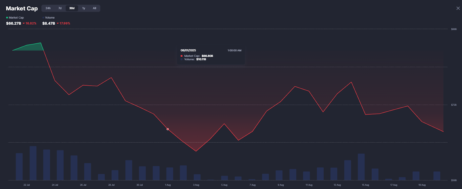 After plunging from $77.7 billion on the finish of July to $62.1 billion on August 3, the sector’s market cap rebounded to $75 billion by mid-month earlier than easing again to $70 billion.