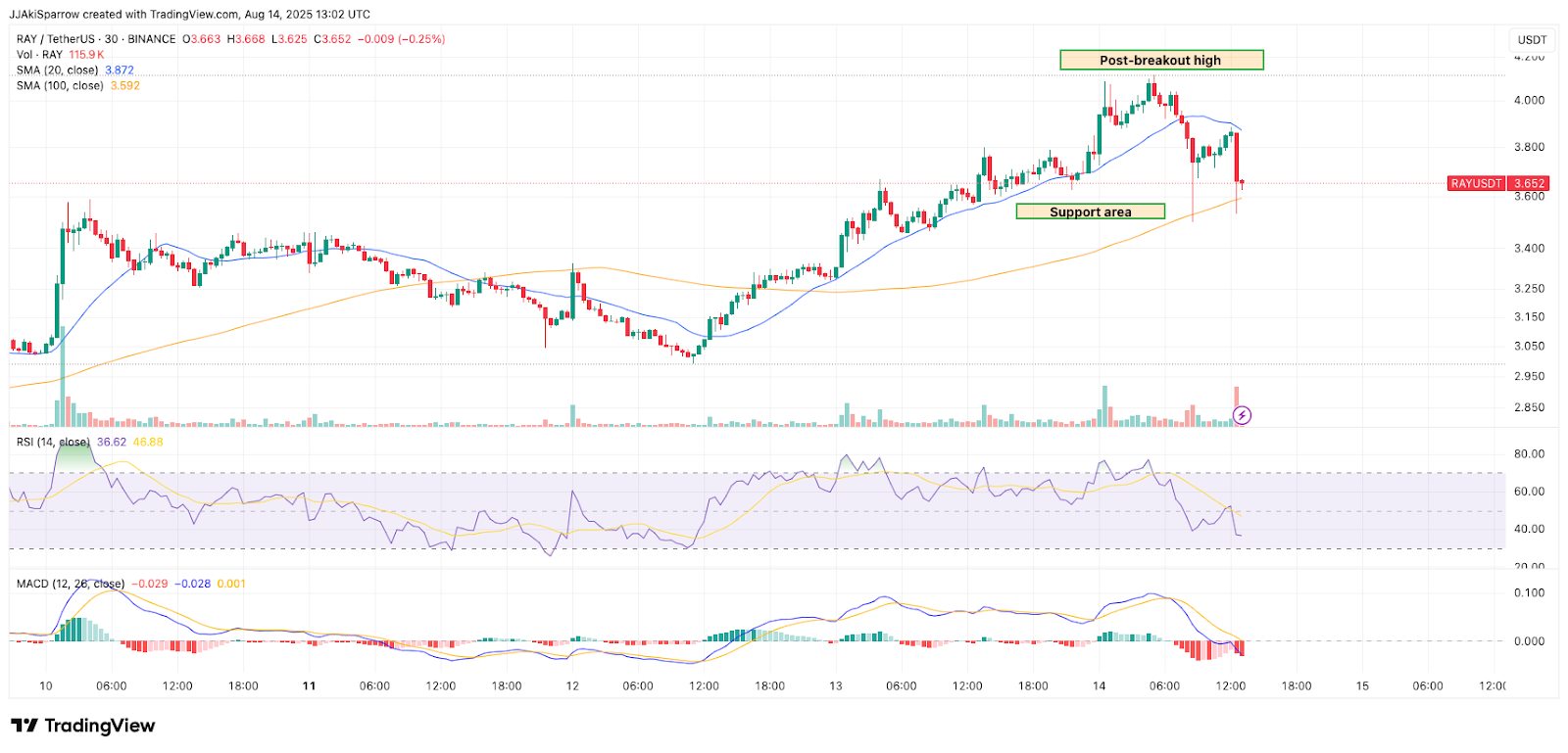 After breaching the local high around $4.20, the asset pulled back sharply and is now hovering near the $3.65 region, just above the 100-period SMA on the 30-minute chart—an area that has functioned as soft support during the last two sessions.