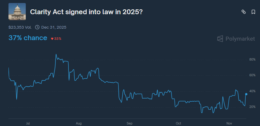Data from the decentralized platform Polymarket shows merchants see a 25% probability the CLARITY Act turns into legislation this 12 months.