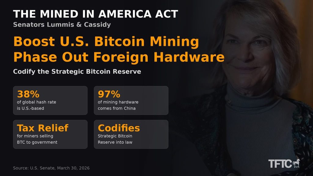 Senators Bill Cassidy (R-LA) and Cynthia Lummis (R-WY) launched the Mined in America Act on March 30, making a federal certification program for home Bitcoin mining operations and codifying President Trump’s Strategic Bitcoin Reserve government order into legislation.