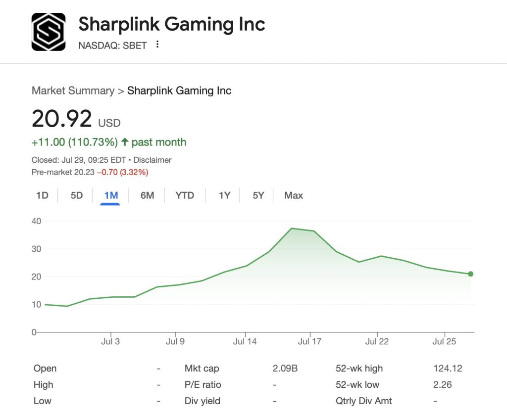 SharpLink Gaming, stock trading under “SBET,” has seen a huge surge over the past month, with its stock price rising by 110.73% to $20.92.