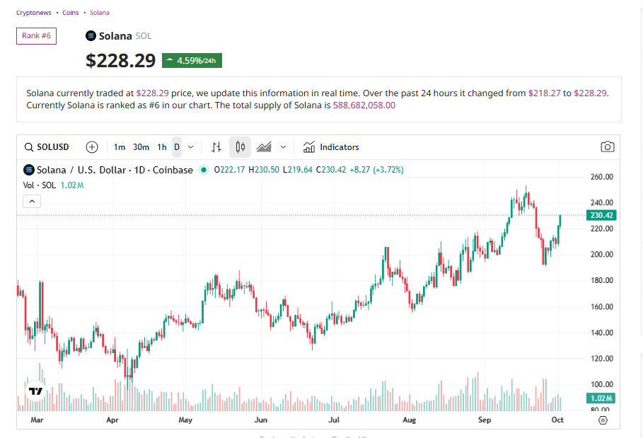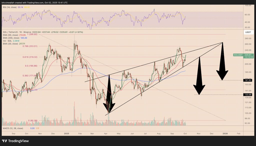 Solana’s value has already gained 9% in October, reaching $227.50. Technical charts present a rising wedge sample that would point out both a breakout towards $300 or a 30% draw back threat if the formation reverses.