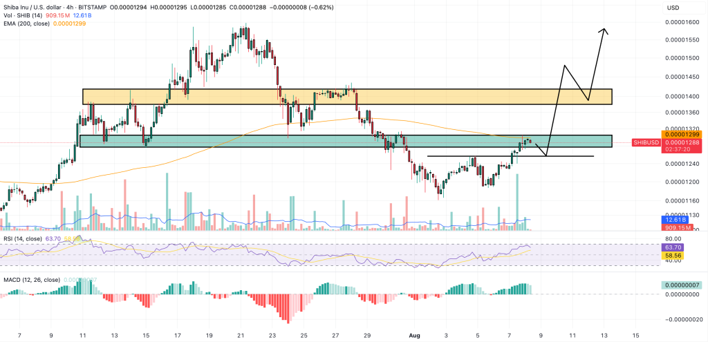 Shiba Inu (SHIB) is now testing a key resistance level at $0.00001300 on the 4-hour chart, with added strength from the 200-period EMA, making this a critical breakout zone.