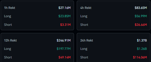 Liquidations exceeded $1 billion over 24 hours, with bitcoin longs accounting for a main share.