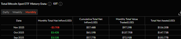 Bitcoin ETFs recorded a month-to-month outflow of $3.70 billion between November 3 and November 24, whereas Ethereum ETFs noticed an outflow of $1.64 billion throughout the identical interval.
