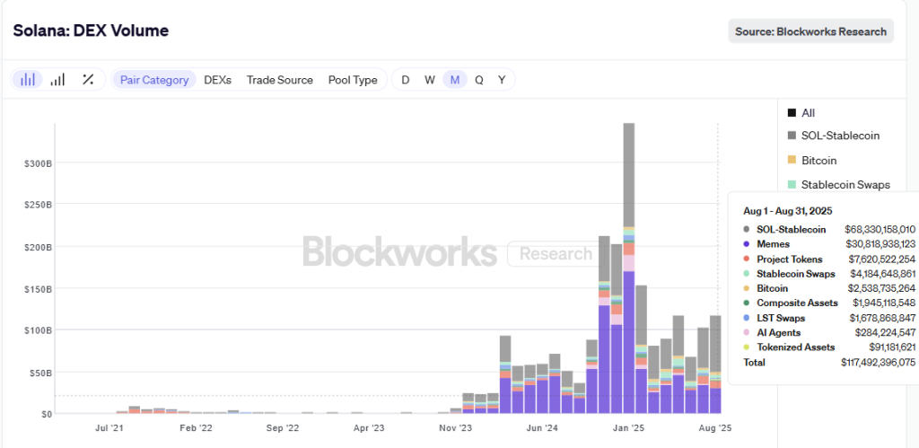 Blockworks information exhibits meme cash as soon as made up over 60% of Solana’s DEX exercise in late 2024 and early 2025. Most of that circulate got here from the now well-known platform pump.enjoyable, which helped Solana almost double Ethereum’s DEX quantity throughout the identical interval.