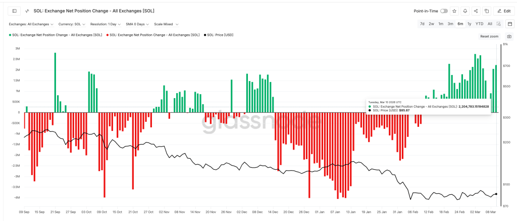 Exchange internet place change exhibits a regular stream of tokens flowing onto exchanges since February. Daily inflows have surged from round 245,691 SOL to greater than 2.2 million SOL inside a month, a rise of roughly 800%.