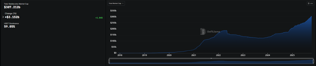 The whole stablecoin market capitalization now exceeds $300 billion, dominated by Tether (USDT) and Circle’s USD Coin (USDC), according to DefiLlama.