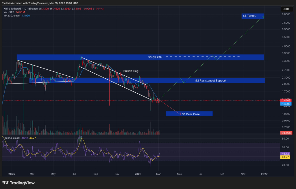 XRP is presently buying and selling close to $1.41, and KIMI predicts a possible rally towards $8 by New Year, representing a sixfold achieve from present ranges.