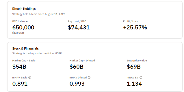 Market web asset worth metrics present the inventory buying and selling near the worth of its Bitcoin holdings. Basic mNAV stands at 0.892, diluted mNAV at 0.994, and enterprise-value mNAV at 1.136, reflecting the impact of debt and most popular obligations.