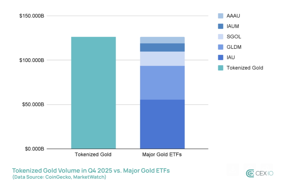Trading exercise tells an much more hanging story. Tokenized gold buying and selling quantity jumped 1,550% year-on-year, reaching $178 billion in complete quantity in 2025. In the fourth quarter alone quantity exceeded $126 billion surpassing the mixed buying and selling quantity of 5 main gold ETFs.