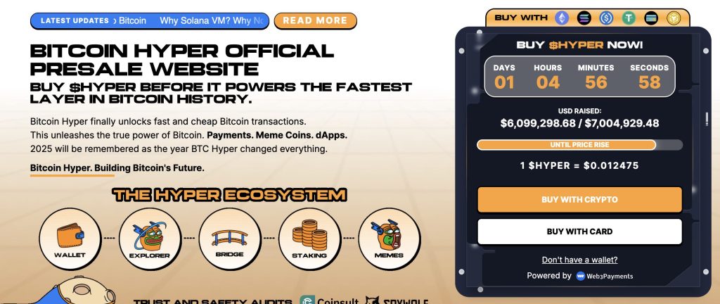 Bitcoin Hyper ($HYPER), the first Bitcoin-native Layer 2 powered by the Solana Virtual Machine (SVM), has raised over $6 million in its public presale, with $6,098,717 out of a $7,004,929 target. The token is priced at $0.012475, with the next price tier expected to be announced soon.