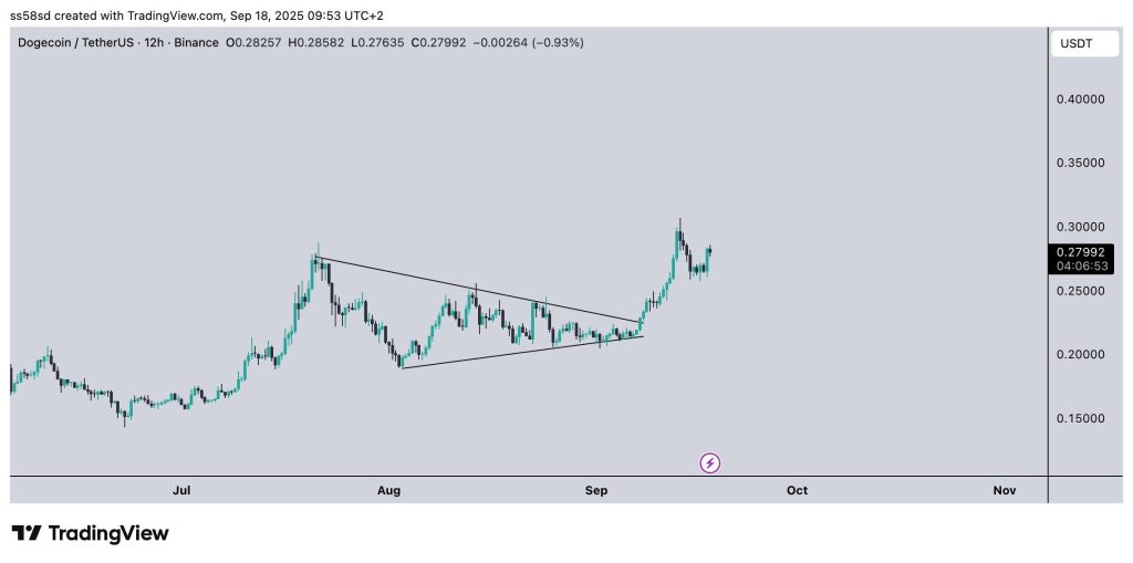 Technical indicators again the optimism. Chart information reveals Dogecoin broke out of a symmetrical triangle sample in early September, rallying towards $0.30. Immediate resistance sits at $0.30–$0.35, with assist close to $0.26–$0.25.