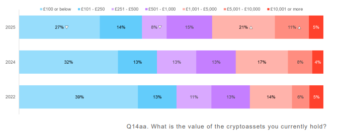 The share of customers holding £1,001 to £5,000 in crypto rose to 21%, up 4 proportion factors from 2024, whereas these holding £5,001 to £10,000 elevated to 11%, up three factors.