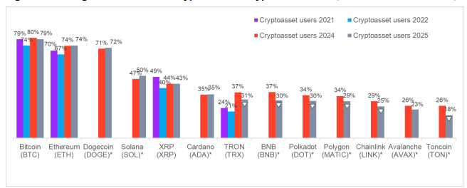 Ethereum adopted at 43%, largely unchanged from 2024. Also, different property had been held at a lot decrease ranges, with Solana, Dogecoin, XRP, and Cardano essentially the most generally talked about past the 2 market leaders.
