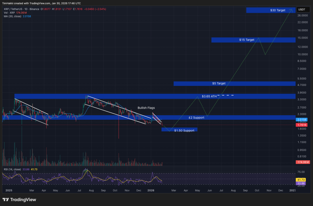 Currently priced round $1.76, KIMI AI estimates that XRP might rise as high as $30 by the finish of 2026. That outlook implies upside of roughly 1,600%, or greater than seventeen occasions as we speak’s valuation.