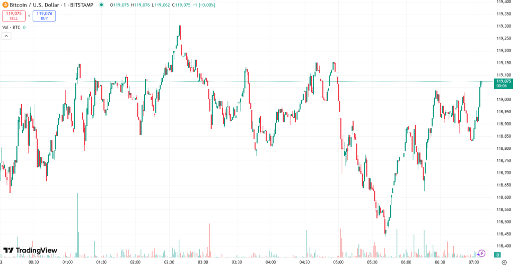 At the time of writing on Thursday morning, BTC trades at $118,947. Its intraday high was $122,052. It plunged from this level to the day’s low of $118,364, before slightly recovering to the current level.