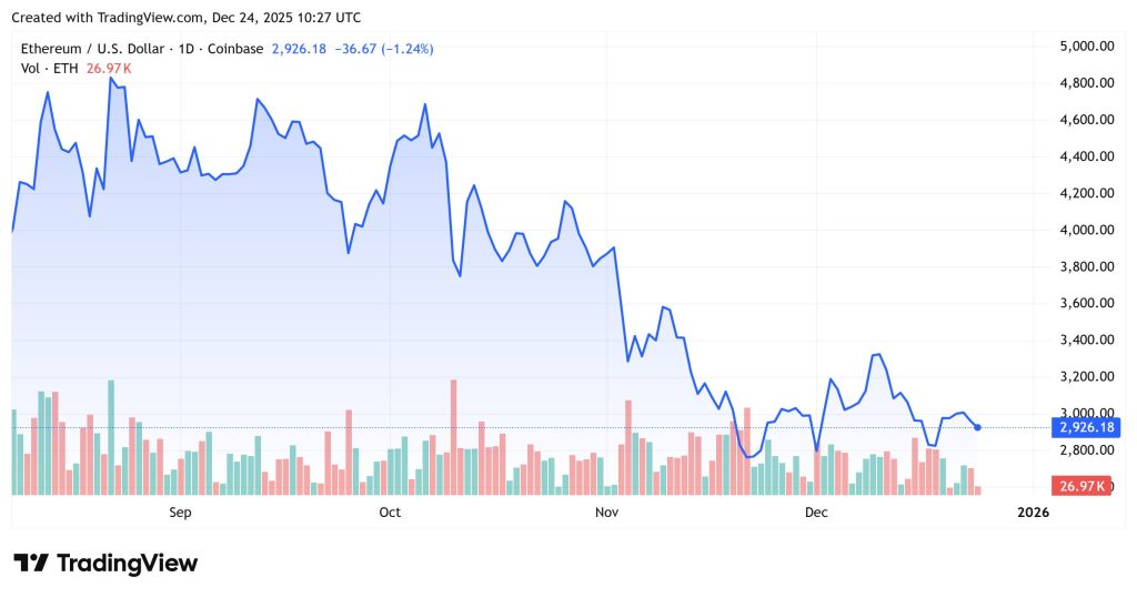 Ethereum is buying and selling round $2,926, down roughly 1.2% over the previous 24 hours. The chart exhibits ETH persevering with to underperform after dropping the $3,200–$3,300 vary earlier in November. Since then, value motion has remained heavy, with decrease highs and restricted follow-through on rebounds.